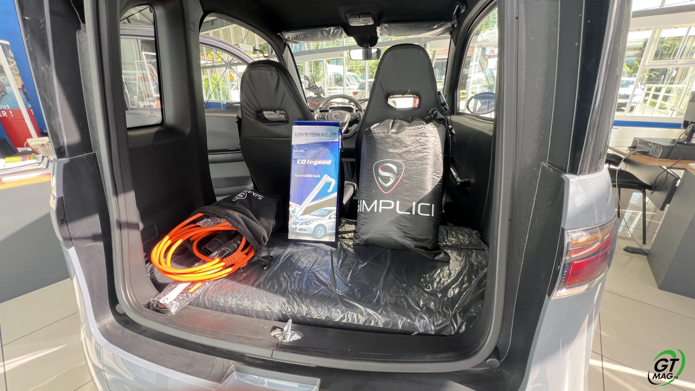L’histoire de Simplici débute avec une idée simple mais puissante : rendre la mobilité accessible à tous, en éliminant les barrières imposées par le permis de conduire. La marque a été fondée par Mr Dayan et Mr Ammar dans le but de répondre aux besoins de mobilité de certaines catégories de la population, notamment les jeunes de 14 à 18 ans, qui peuvent conduire des véhicules légers sans permis, ainsi que les personnes âgées ou celles qui ont perdu leur permis de conduire pour des raisons diverses. Vous le verrez sur nos images un des gros avantages de la Simplici S1 c’est son volume de coffre plutôt spacieux avec 400 litres avec 105 cm de long, 45 cm de profondeur et 95 cm de hauteur.… De quoi transporter quelques valises de livres pour les élèves trop studieux ou tout simplement les courses faites pour toute la famille…