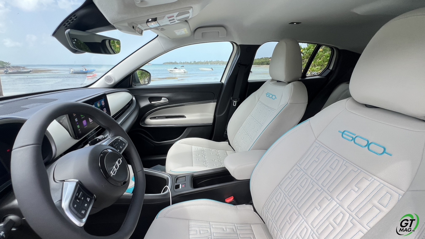 La finition haut de gamme de la Fiat 600, La Prima, ajoute la caméra de recul, les clignotants à LED, le chargeur à induction, la conduite autonome de niveau 2, la climatisation automatique, les détecteurs d’angles morts, le frein à main électrique, le hayon à ouverture mains libres, l’ouverture et le démarrage sans clés, le régulateur de vitesse adaptatif, la navigation, les vitres arrière surteintées et propose la sellerie ivoire soft touch et la lumière d'ambiance on est dans le raffinement à l'intérieur, c'est surtout la liste des équipements qui s'étoffe. Elle comprend notamment des aides à la conduite, comme la reconnaissance des panneaux de signalisation, le régulateur de vitesse adaptatif, la caméra de recul à 180°, des radars de stationnement à 360° et l'assistant aux embouteillages pour une conduite assistée de niveau 2. Côté confort, on peut compter sur l'ouverture et le démarrage sans clé, le hayon à ouverture électrique mains libres, la climatisation automatique et la navigation connectée.
