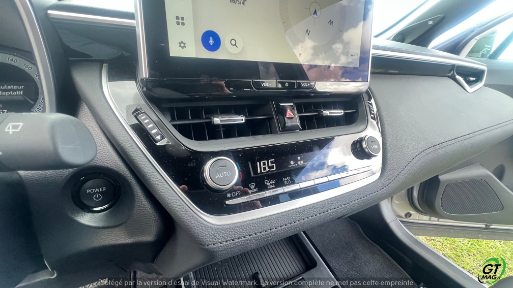 Gtmag prend en main ce matin le Corolla CROSS SRX Hybride de 178ch… Par rapport à la berline dont il dérive, le Corolla Cross joue dans la cour des ‘SUV’ urbains et propose un style et des détails esthétiques très personnalisés. La face avant en est le parfait exemple, avec une calandre imposante encadrée par des projecteurs effilés qui s’étirent sur les ailes. Fidèle à l’identité hybride de la marque, le logo Toyota se pare d’un subtil halo bleu, rappelant l’engagement environnemental du constructeur. Cela dit, la silhouette conserve un bon équilibre. Avec une longueur d’environ 4,5 mètres, le Corolla Cross reste facile à stationner en milieu urbain tout en offrant une garde au sol suffisante pour affronter nos chemins vers les plages ou notre réseau secondaire parfois agressif…