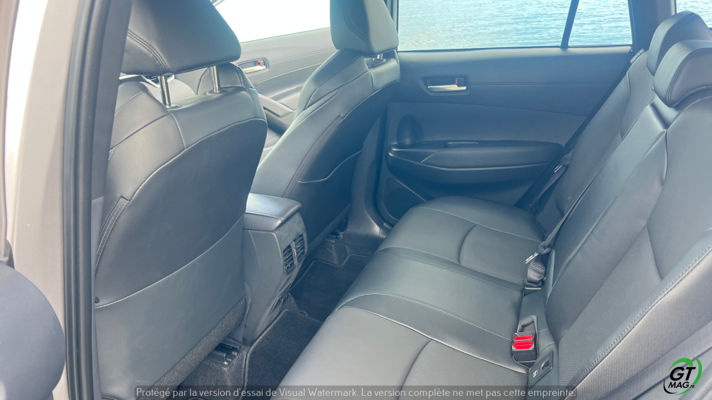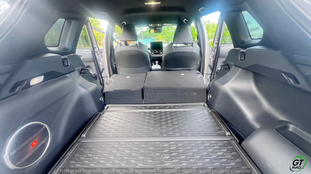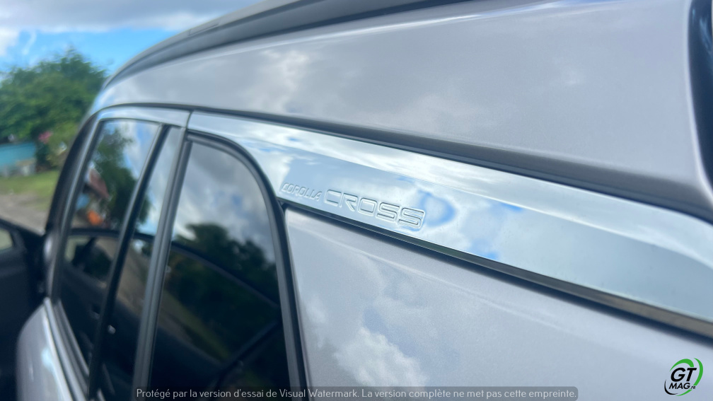 Le profil, lui, met en scène des ailes légèrement galbées, des jantes en alliage’ de 18’’ et des protections en plastique noir courant sur toute la partie inférieure de la carrosserie. Une élégante lame chromée vient dynamiser la ligne de toit, qui s’incline légèrement vers l’arrière, meublé par de larges blocs de feux. Le hayon, doté d’une ouverture entièrement motorisée, est une exclusivité de la finition haut de gamme «SRX», celle de notre modèle d’essai. On termine cette revue du Toyota Corolla Cross avec l’antenne de toit type requin et pour un plus bel effet des ornements supérieurs de vitres chromés… En prime de ces nouveautés, le SUV nippon peut également revêtir une finition GR Sport aux pare-chocs et jantes spécifiques ainsi qu'à la suspension abaissée de 10 mm.