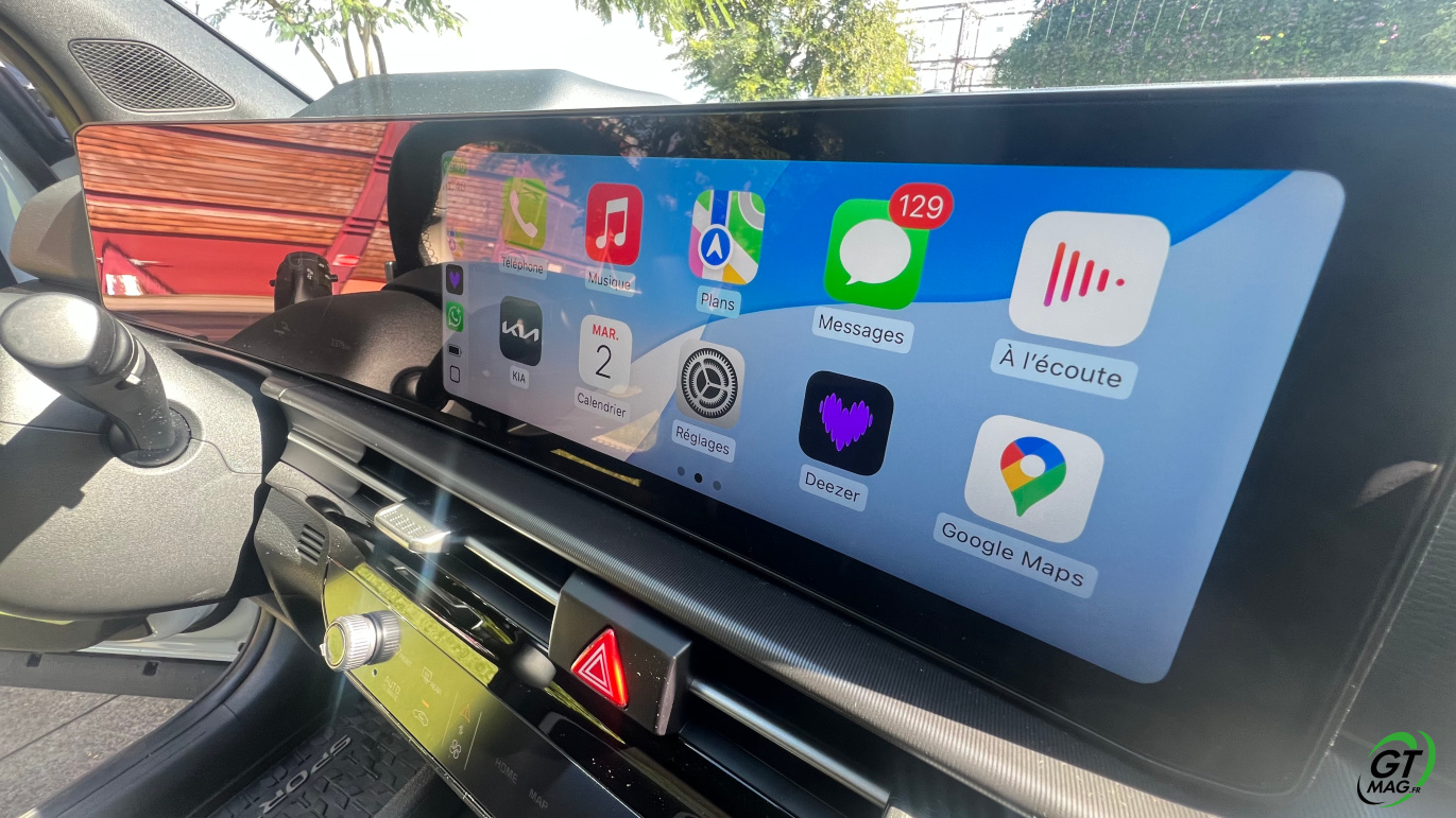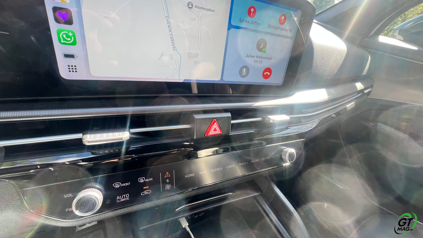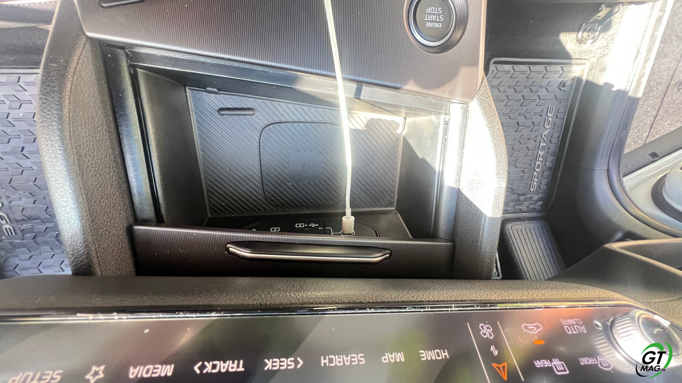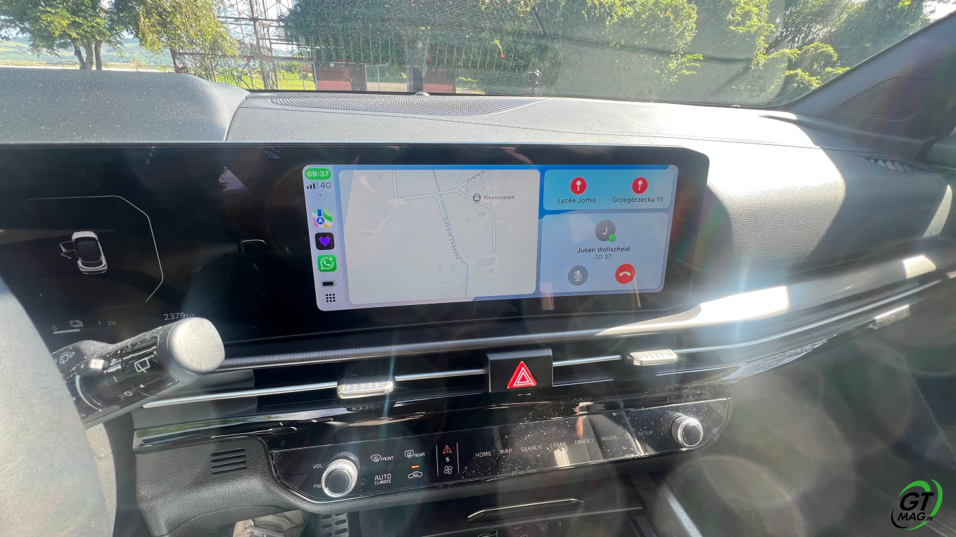 L’intérieur se transforme également très nettement…. Le Sportage hybride restylé reçoit de série un tableau de bord numérique de 10 pouces et un écran central tactile incurvé de 12,3 pouces réunis au sein d’une double dalle aux bords moins épais qu’auparavant. Les aérateurs de forme inédite sont maintenant rassemblés dans un bandeau ininterrompu courant sur toute la largeur de la planche de bord. Sous l’écran central, le réglage de la température passe toujours par des molettes. Les autres commandes de la ventilation sont plus ergonomiques. Entre le nouveau volant à deux branches et la console centrale, les ingénieurs ont su garder des boutons dédiés à certaines aides à la conduite, telle celle garantissant le maintien du véhicule dans sa voie. Conduite semi-autonome de niveau 2, caméras à 360° et chargeur de smartphone à induction font partie des équipements de notre modèle d’essai… Tout cela est résolument plus moderne…