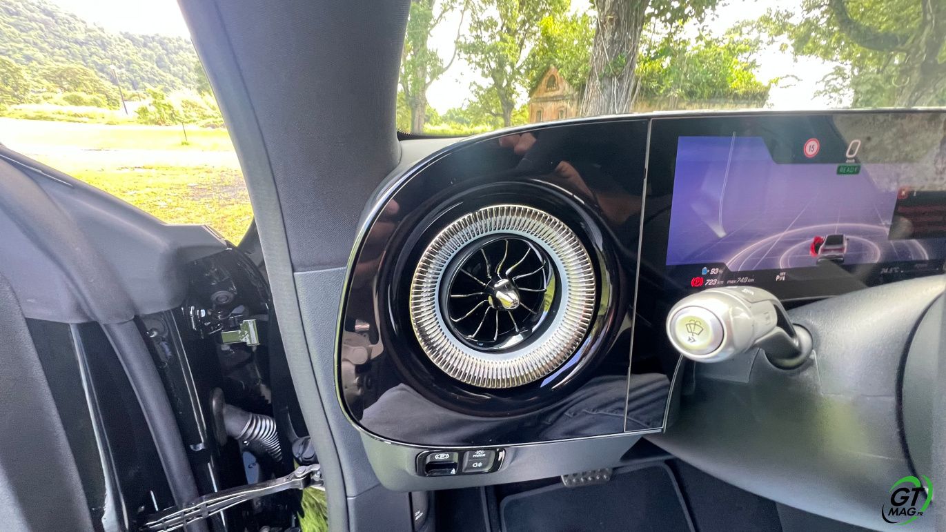 À bord, on découvre le « MBUXSuperscreen » Mercedes qui s’étend, de manière assez massive, sur toute la largeur de l’habitacle. Derrière une grande surface vitrée se trouvent l’écran du conducteur (10,25 pouces) et l’écran central (14 pouces). En option, un écran supplémentaire (14 pouces) est disponible pour le passager avant. Sans cette option, le passager aura, face à lui, une grosse pièce en plastique noir décorée d’étoiles. Ça impressionne, surtout avec l’écran passager. Si vous choisissez l’option écran passager, ce dernier bénéficie également d’un écran de 14 pouces, pour regarder des vidéos en streaming ou même jouer à des jeux pendant le trajet, grâce à un système d’assombrissement de l’écran qui évite de distraire le conducteur. Placées à gauche et à droite de ce « bloc », les ouïes de ventilation ont un aspect original, ce qui est moins le cas des ouïes placées sous l’écran central.