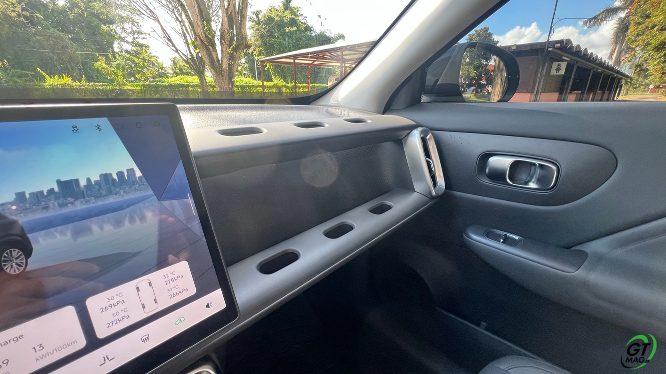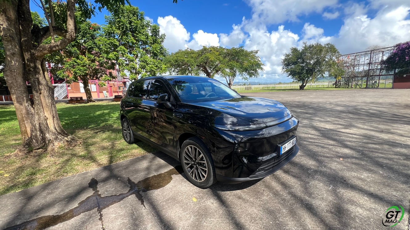Les Leapmotor B10 et C10 partagent une plateforme et leurs technologies. Pas étonnant donc de retrouver le moteur électrique de 218 ch sur le train arrière du petit crossover. Il présente aussi une suspension McPherson à l’avant, 5 bras à l’arrière et même une répartition du poids 50/50. Ce dernier élément est sans doute aidé par les batteries. Eh oui, il y a en a deux au catalogue on l’a vu. En Martinique la grande batterie présente une capacité de 67,1 kWh, ce qui lui permet d’offrir une autonomie de 434 km. Elle charge à 168 kW elle prendra 20 min pour passer de 10 à 80 % de charge sur une borne rapide. Côté consommation et d’après mes petits calculs, il faudra toutefois tabler sur un appétit moyen gravitant autour des 16 à 18 kWh/100 km, soit près de 360 km à 390 km d’autonomie. Ma conduite, mon style ont été plutôt raisonnable flirtant parfois avec une écoconduite que je maitrise très bien, mais aussi des moments d’accélérations voulues et prolongées sur notre rocade ou autoroute…