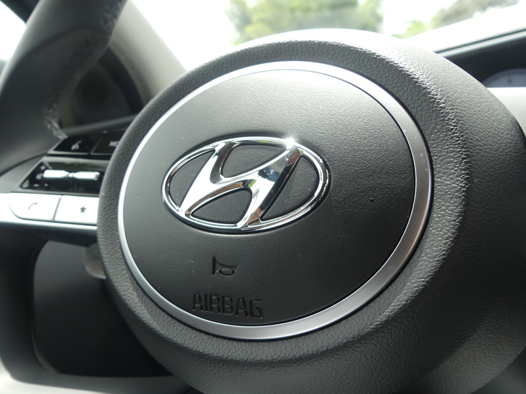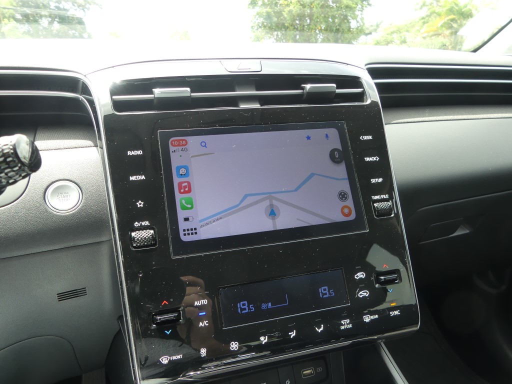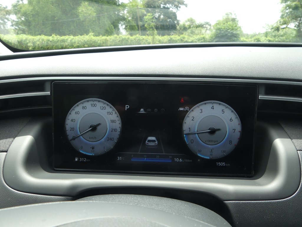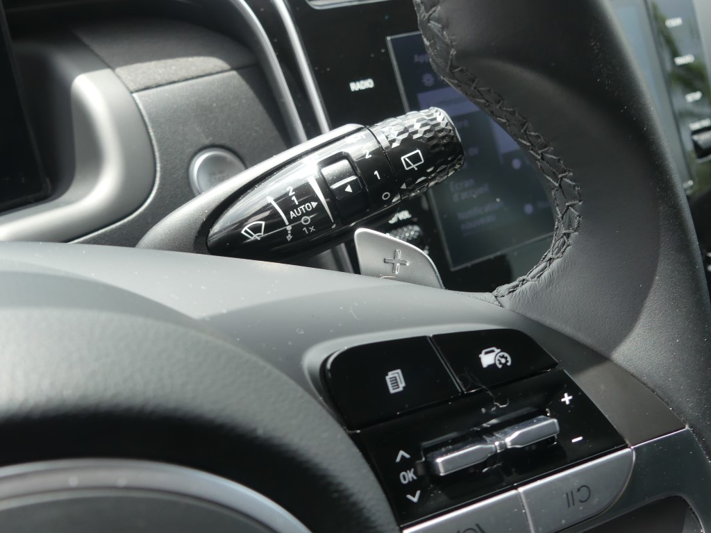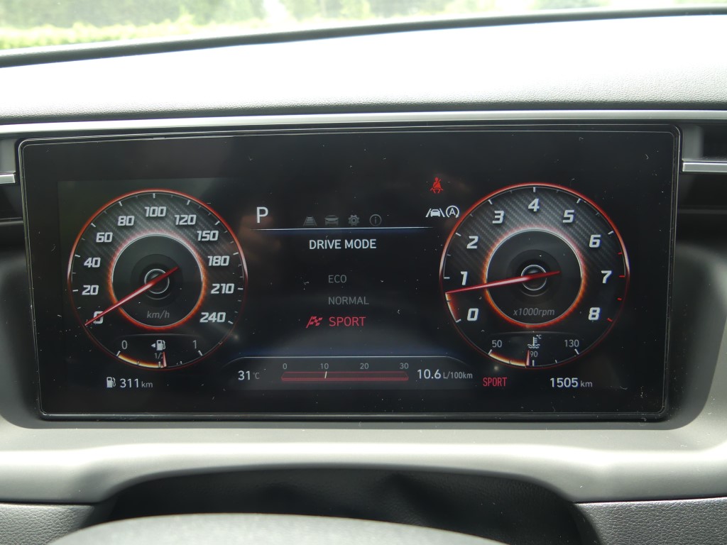 A bord, je découvre l’apparition d’une nouvelle planche de bord, épurée et centralisant la plupart des fonctions directement dans le système multimédia. Le levier de commande de boîte automatique est pour sa part évincé, au profit de boutons, moins encombrants. Le conducteur profite également d’un nouveau volant très ergonomique. L’instrumentation digitale repose sur un grand écran de 10,25 pouces. Du côté de la dotation de série, Hyundai propose un système à sept airbags, un programme de pré-collision, le maintien de voies ou encore un régulateur adaptatif capable, à la demande, de s’adapter aux limitations de vitesse en vigueur. Le système multimédia tactile repose de série sur un écran de 8 pouces. En optant pour le modèle supérieur, l’écran passe à 10,25 pouces. Il inclut les surcouches Android Auto/Apple CarPlay, ainsi que de nombreux outils connectés. Le système intègre également une notion de “sessions”, permettant à plusieurs utilisateurs du véhicule de personnaliser l’ensemble des paramètres à leur guise. En dehors de ce système multimédia parfois peu intuitif avec ses menus chargés, l’intérieur dégage une ambiance très premium, grâce à l’utilisation de matériaux de bonne facture.