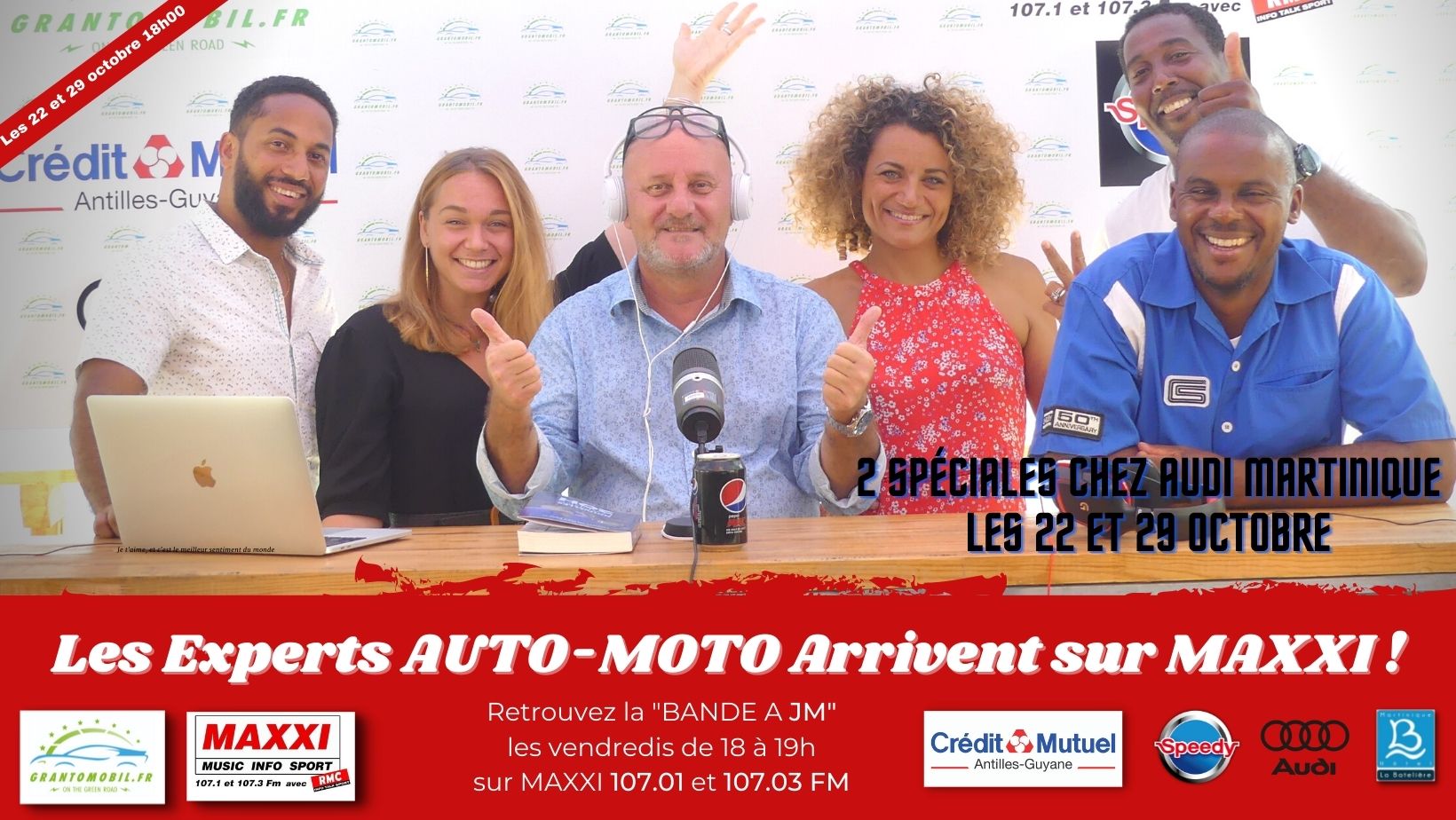 Ne ratez pas notre émission spéciale en live chez AUDI Martinique, avec la bande à JM et les Experts Auto-Moto les vendredis 22 et 29 octobre diffusée sur Maxxi Martinique 107,1 et 107,3 FM diffusée en simultanée sur GT Auto Youtube !!!