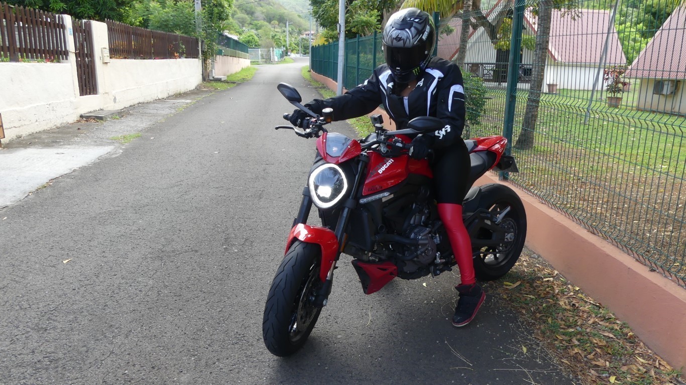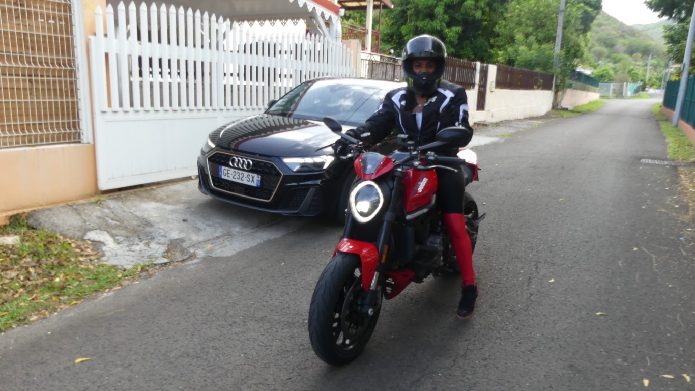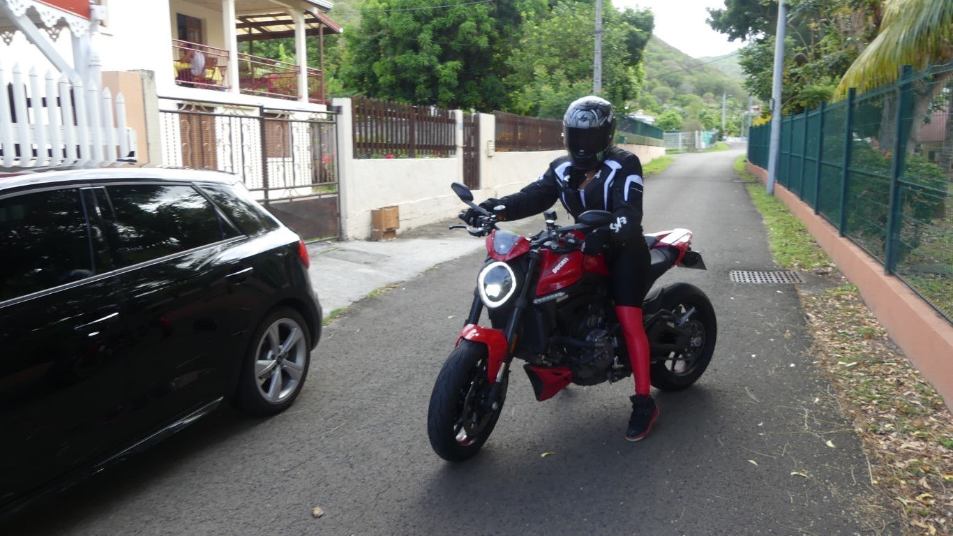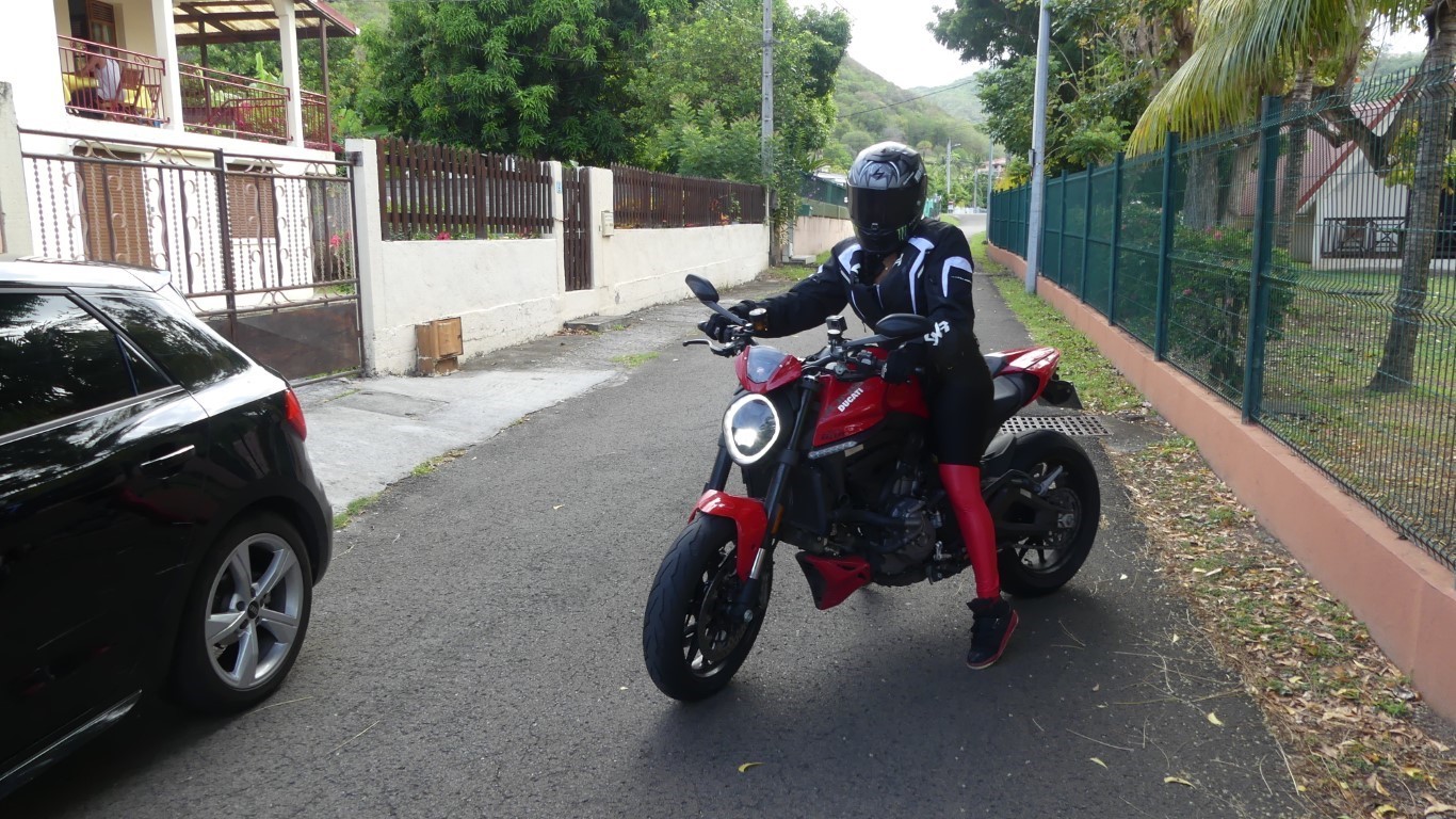 En gros un jouet des villes qui ne rechignera pas à grimper les hauts mornes de Martinique de façon sportive voir agressive selon vos souhaits en jouant avec ses 3 modes de conduite : Urban, Touring et Sport. Ils jouent sur la cartographie, mais aussi sur le traction control et l’ABS. Sachant qu’il est possible de changer de mode en roulant ! Ducati n’a pas lésiné puisqu’il est possible de rentrer dans les cartographies pour les configurer plus finement. Les plus téméraires déconnecteront l’anti-wheeling ou réaliseront un démarrage canon en usant du Launch Control. Allé et si on demandait à Claire Boulogne ce qu'elle en pense elle de sa moto ??? Entendez-la dans notre essai vidéo ci-dessus...