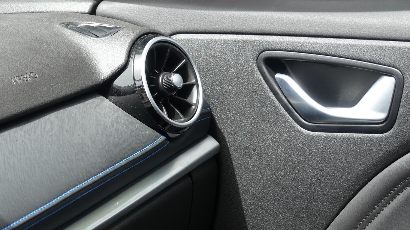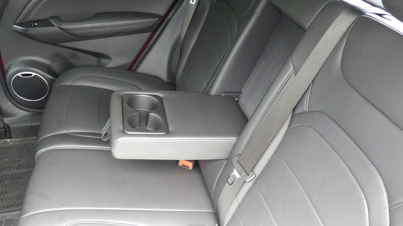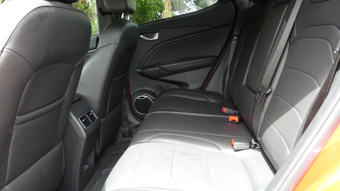 A l'intérieur tout est fait pour gagner en espaces : l'empattement de 2,66 m octroie une bonne habitabilité aux occupants de fait, à l'arrière 3 passagers seront surement à leur aise. Ah mince le volume du coffre est oublié avec à peine 318 l (1200 l banquette rabattue), sa contenance est moindre que celle d'un Peugeot e-2008, pourtant moins bien dimensionné. Dommage, cela restreindra assurément son usage... Je suis agrablement surpris par le design des différents éléments qui compose l'univers du conducteur. L'ensemble est assez sobre, pas trop encombré par une multiplication de boutons qui pourrait perturber le béotien. Les parties supérieures en plastique moussé sont correctes et la large bande de similicuir aux surpiqûres bleues, qui surmonte une ligne d'aluminium brossé, donne une touche moderne, aérée et lumineuse à la planche de bord. La finition globale intérieure reste tout de même avec quelques approximations comme certaines mousses isolantes apparantes... Rien de si grave sur le sentiment global du véhicule...