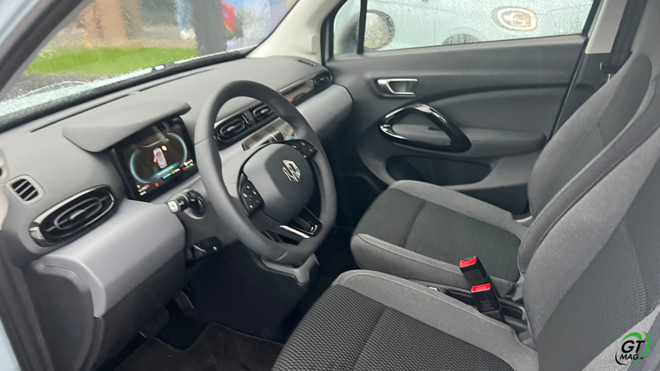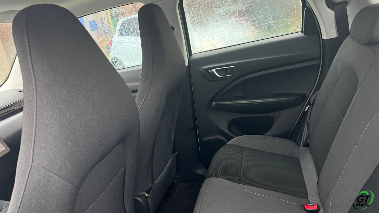 Avec une longueur de 3,62 m, la T03 est 10 cm plus courte qu’une Dacia Spring et 5 cm plus courte qu’une Fiat 500e. En largeur, ses 1,62 m sont à comparer au 1,58 m de la Dacia Spring ou au 1,68 m de la 500e. Quant à la hauteur, son 1,57 m de haut permet de loger deux grands adultes à l’arrière ce qui n’est pas vraiment possible dans la Spring ou 2 enfants dans leurs sièges (ou réhausseurs) respectifs sur la banquette qui se rabat d’une seule pièce… Ce qui est amusant quand on sait que certains gros SUV coupés ne le permettent pas. Le coffre propose 210 l de volume c’est tout de même rikiki, c’est moins que la Spring à 270 l mais mieux que la 500e à 185 l. Ce coffre passe à 880 L sièges rabattus… Ouf…