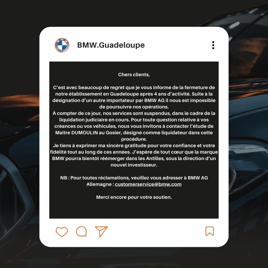Pourtant une des plus belle marque Prémium automobile mérite assurément un repreneur solide qui sera capable de sublimer les très belles gammes de la marque Allemande BMW, tout comme celle de MINI ou encore la qualité impérative due à leurs services après-vente… La clientèle Antillaise est Fan des marques Allemandes sans aucun doute possible… Pour preuve de nombreux clubs BMW et MINI égayent nos routes certains Week-Ends…