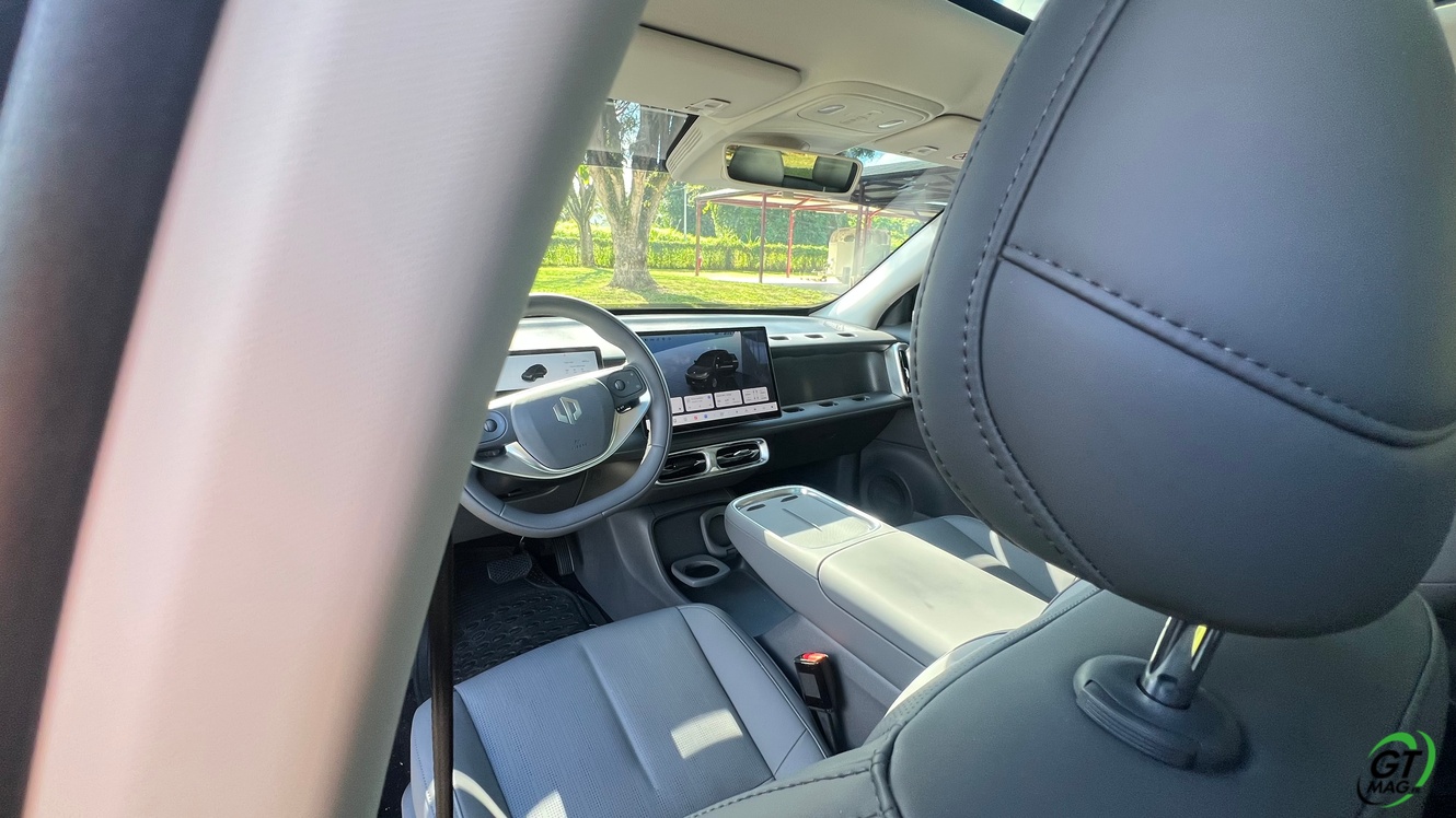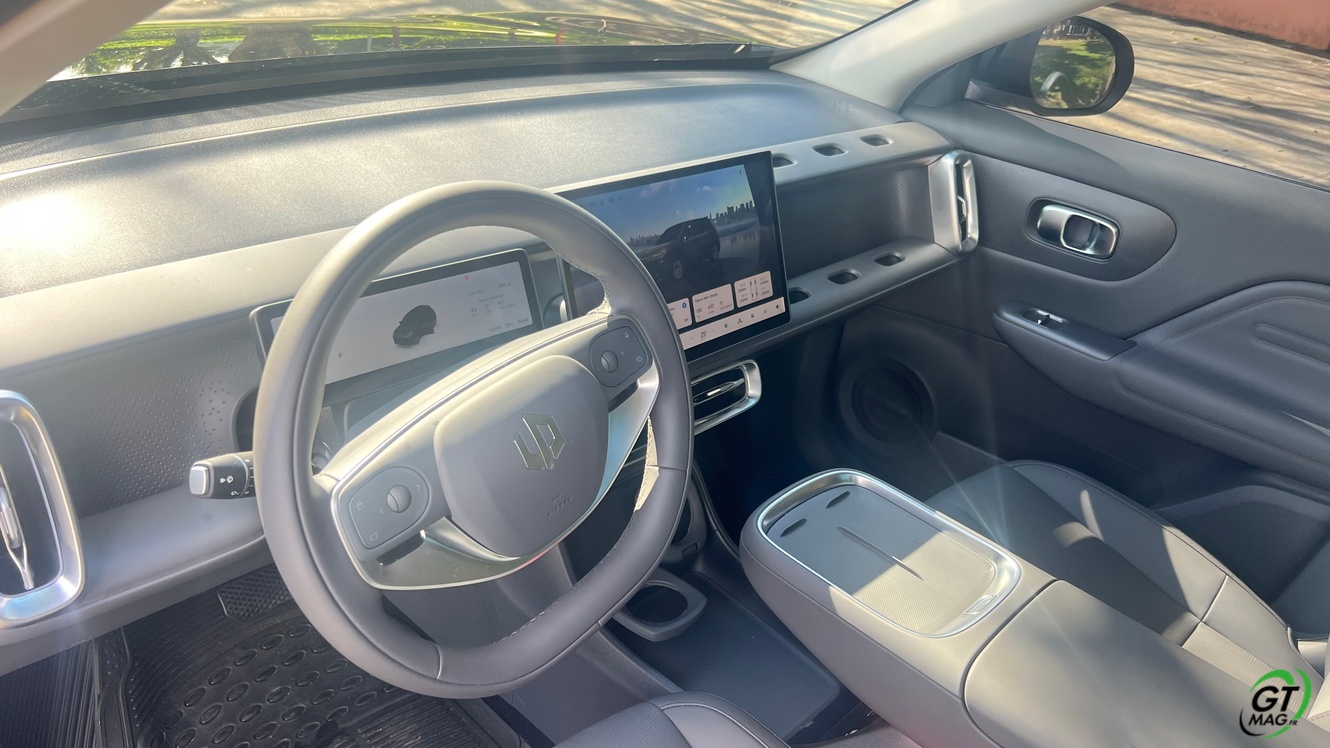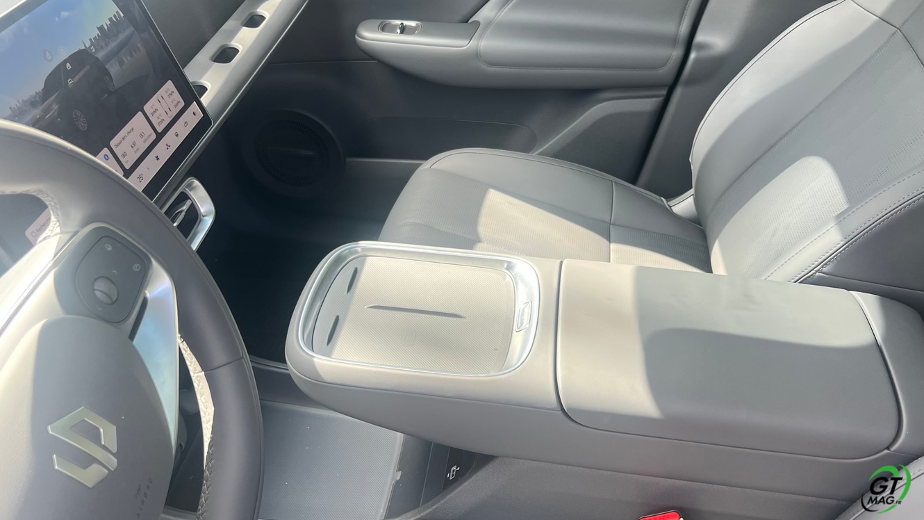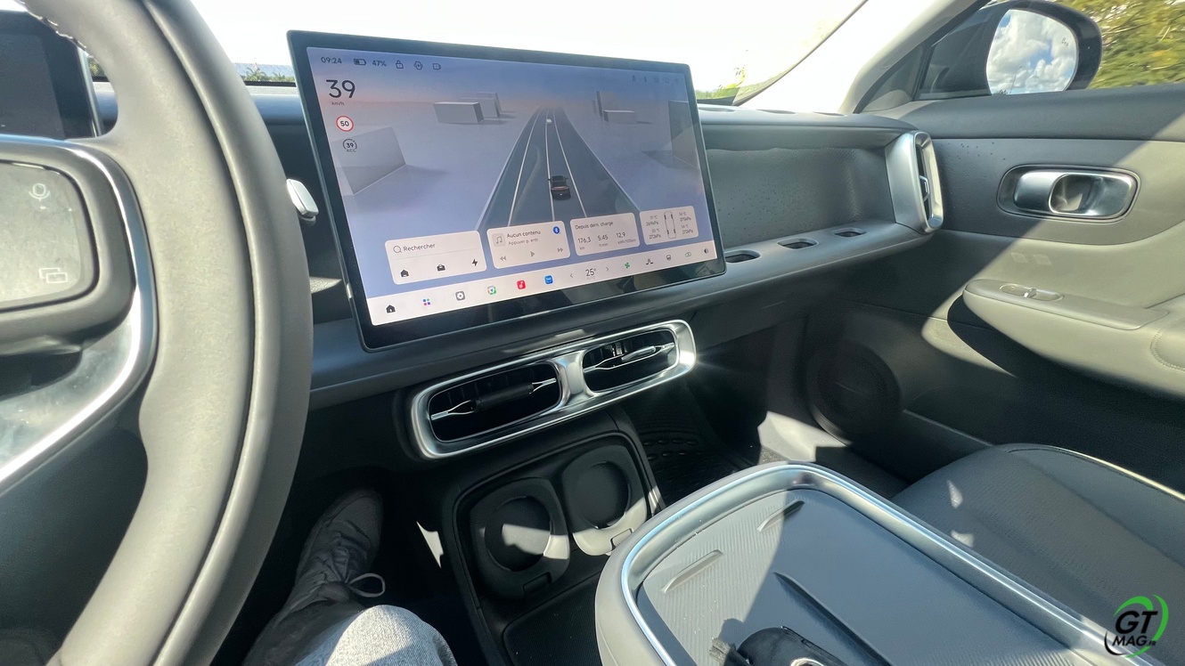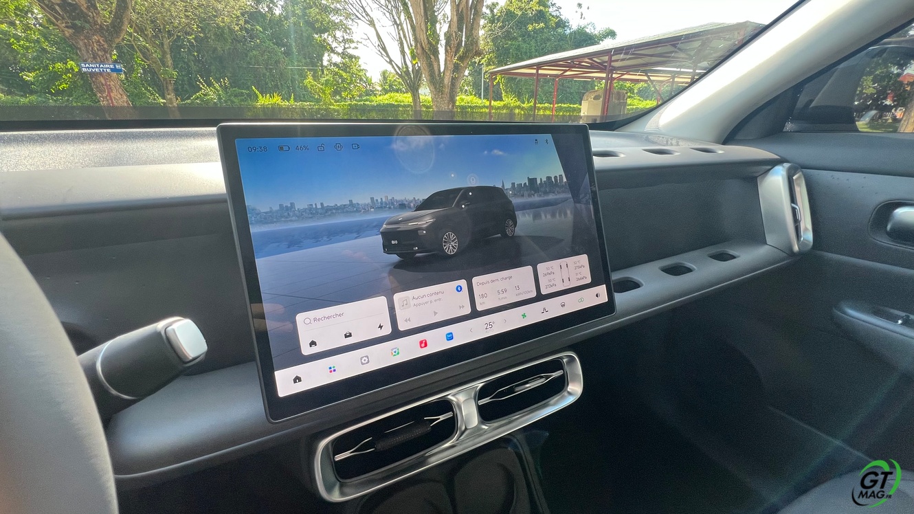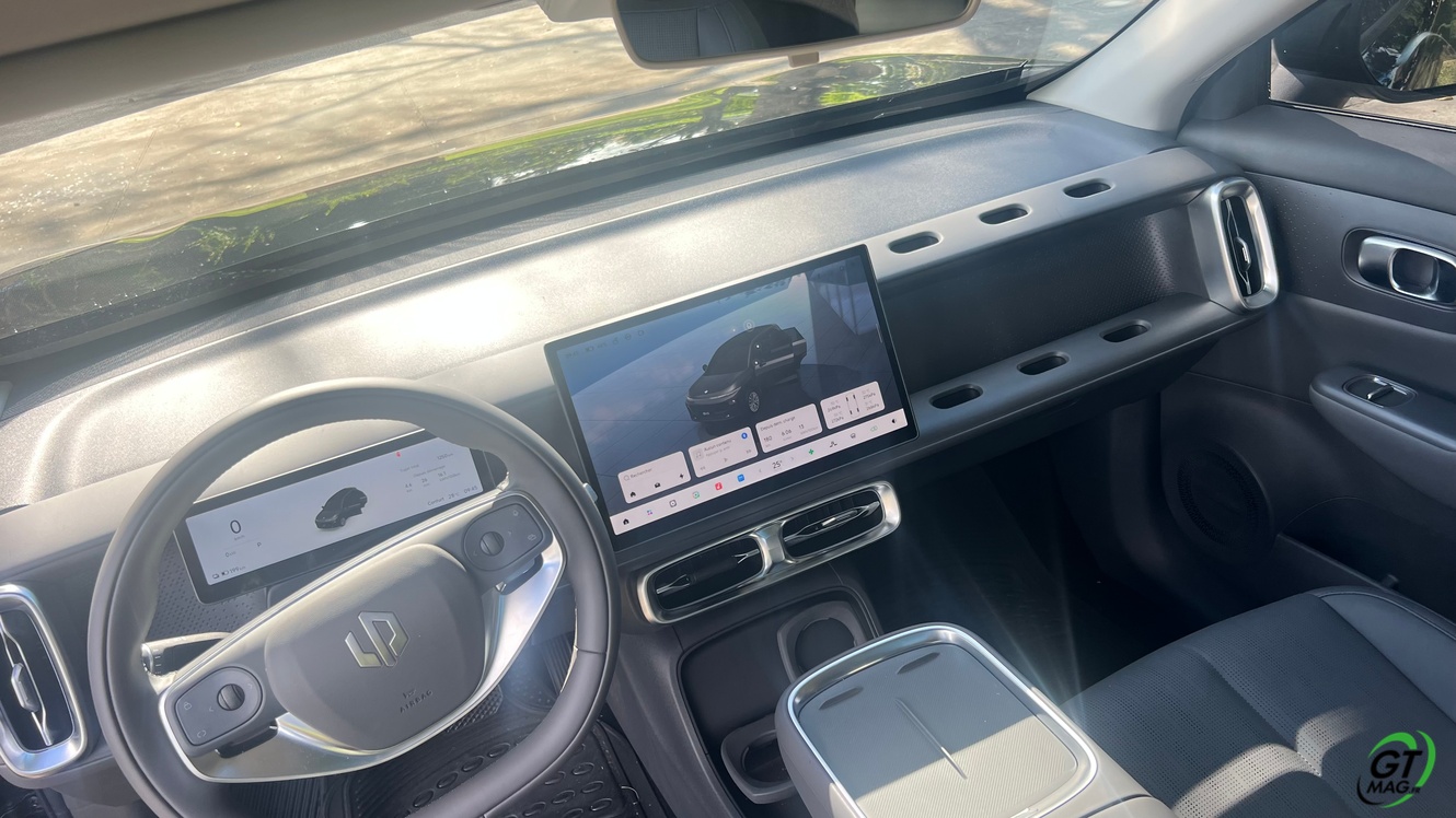 Dans l’habitacle, le Leapmotor B10 suit son propre chemin avec une planche de bord à deux étages. À notre grand étonnement et plaisir, on trouve des buses de ventilation, ainsi qu’un espace de rangement bien pratique devant le passager. En sus, il y a un grand bac dans la console centrale et deux porte-gobelets escamotables. Une chose est sûre : ce ne sont pas les rangements qui manquent ! D’ailleurs, toujours sur le point du rangement et de l’habitabilité : le Leapmotor B10 joue bien de sa taille pour offrir un habitacle généreux. Devant comme derrière, tous les passagers seront bien assis, tandis que le coffre taille à 430 litres. Mieux encore, il y a 25 litres d’espace sous le capot. Pratique pour les câbles !  Côté infodivertissement, tout passe va une grande dalle tactile de 14,6 pouces – en plus d’une instrumentale digitale de 8,8 pouces. Quand on dit « tout », c’est vraiment « tout », puisque le B10 ne présente aucun bouton. Pas même pour régler les rétroviseurs…