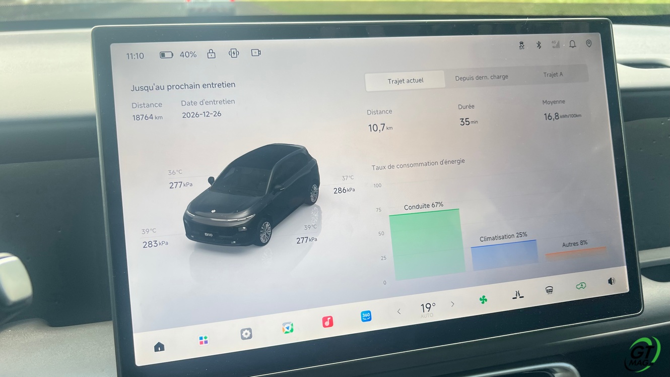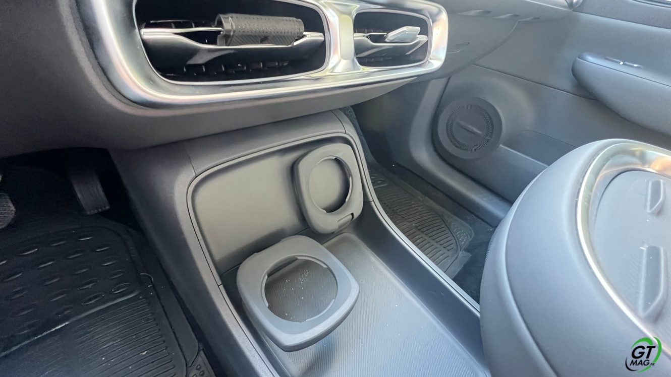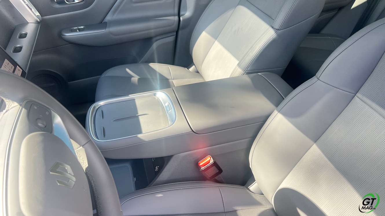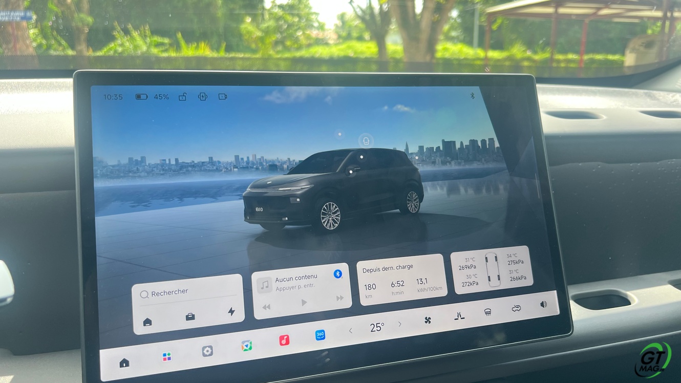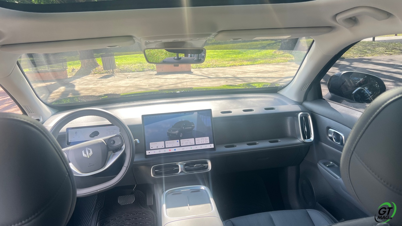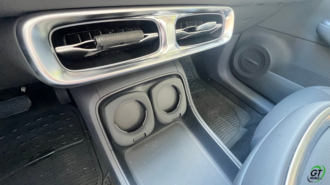 Dans l’habitacle, le Leapmotor B10 suit son propre chemin avec une planche de bord à deux étages. À notre grand étonnement et plaisir, on trouve des buses de ventilation, ainsi qu’un espace de rangement bien pratique devant le passager. En sus, il y a un grand bac dans la console centrale et deux porte-gobelets escamotables. Une chose est sûre : ce ne sont pas les rangements qui manquent ! D’ailleurs, toujours sur le point du rangement et de l’habitabilité : le Leapmotor B10 joue bien de sa taille pour offrir un habitacle généreux. Devant comme derrière, tous les passagers seront bien assis, tandis que le coffre taille à 430 litres. Mieux encore, il y a 25 litres d’espace sous le capot. Pratique pour les câbles !  Côté infodivertissement, tout passe va une grande dalle tactile de 14,6 pouces – en plus d’une instrumentale digitale de 8,8 pouces. Quand on dit « tout », c’est vraiment « tout », puisque le B10 ne présente aucun bouton. Pas même pour régler les rétroviseurs…