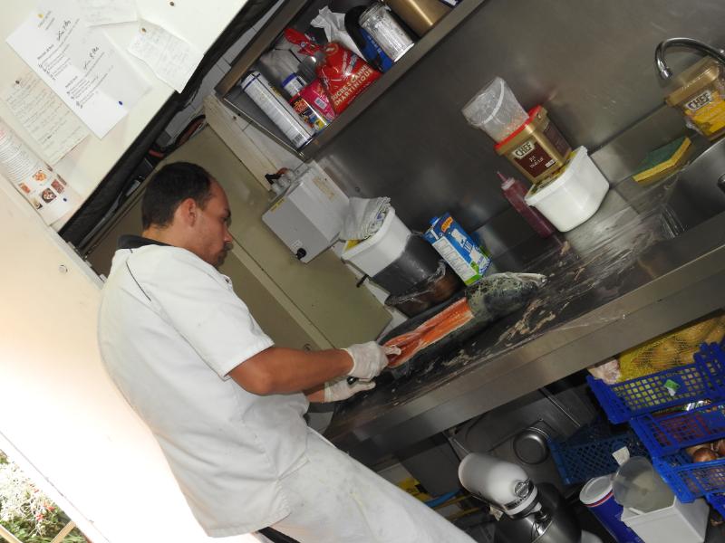 Bien-sur, l'Ardoise Bistrot propose ses viandes et poissons frais... La découpe et la transformation des produits frais se fait au restaurant le matin avec mon équipe... Je dois dire que notre clientèle apprécie particulièrement les poissons de métropole tel le carrelet, la limande, le saumon mais aussi la sole très prisée chez nous.... Puis vient les tripes, les rognons, les rognons de porcs grillés, la tête de veau... Plus classique mais incontournable en Martinique, le Magret de canard que je sert avec une sauce aux figues fraîches par exemple... Je remarque que nos Hits sont souvent des mets aux cuissons longues, je pense que nos clients veulent manger ce genre de plats difficiles à réaliser à la maison... Je dois remercier ma très bonne et très efficace équipe en cuisine vraiment j'ai une brigade en or... Merci les filles...Rires...»