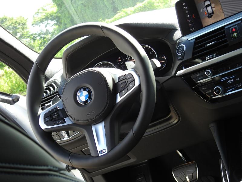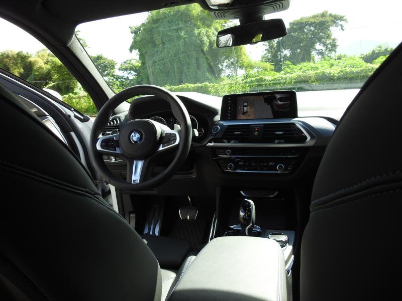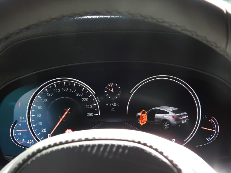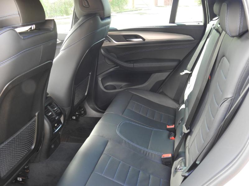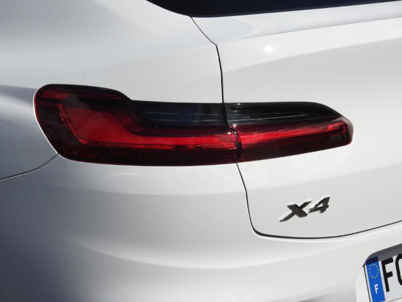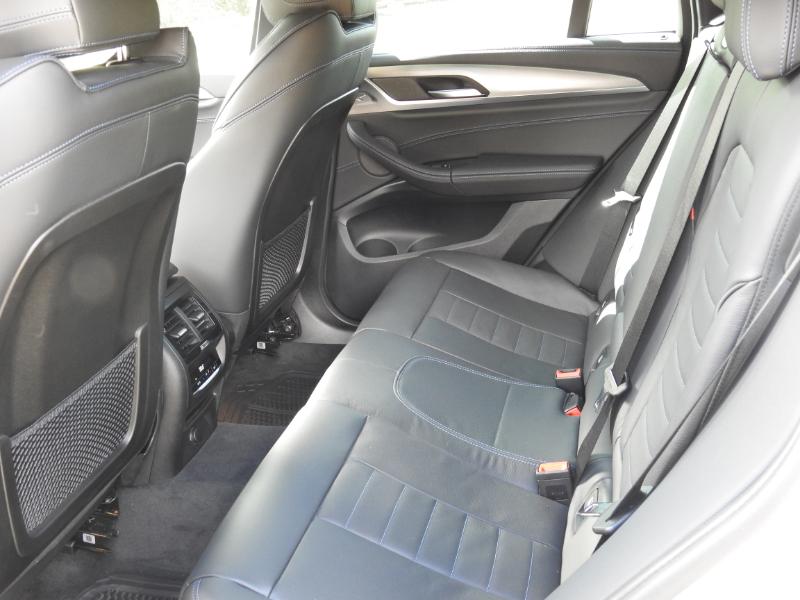 Ce X4 deuxième version est encore plus « coupé » que son prédécesseur. Cela se vérifie dans l’habitacle avec une assise surbaissée de 20 mm à l’avant et 28mm à l’arrière par rapport au X3. La position de conduite de ce SUV/SAC en ressort un peu plus sportive tandis que les grands gabarits seront mieux accueillis à l’arrière. Attention, ambiance sportive garantie, la banquette arrière en 3 partie n’accueille réellement confortablement que deux adultes et la visibilité y est des plus réduite. Le volume de coffre est très intéressant variant de 525 à 1 430 litres avec même un petit volume sous le plancher. Heureusement le grand hayon se manoeuvre électriquement de série et s’ouvre en passant le pied sous le bouclier si vous avez retenue l’option. Très « techno » le nouveau BMW X4 propose un tableau de bord résolument à la pointe dans un habitacle identique à celui du X3, avec un grand écran tactile avec commandes vocales et gestuelles, l’indispensable affichage tête haute, le HotSpot wifi, la synchro téléphone BMW et Apple CarPlay (pas Android Auto) et les services Connected Drive (Microsoft Office, l’info trafic RTTI, la conciergerie). Pour la sécurité et le confort de conduite on remarque la version la plus évoluée du régulateur de vitesse adaptatif ACC+, un dispositif anticollision latéral actif, les assistants de direction et de trajectoire, des avertisseurs d’approche et de croisement, l’assistance au stationnement, etc. Belle dotation !
