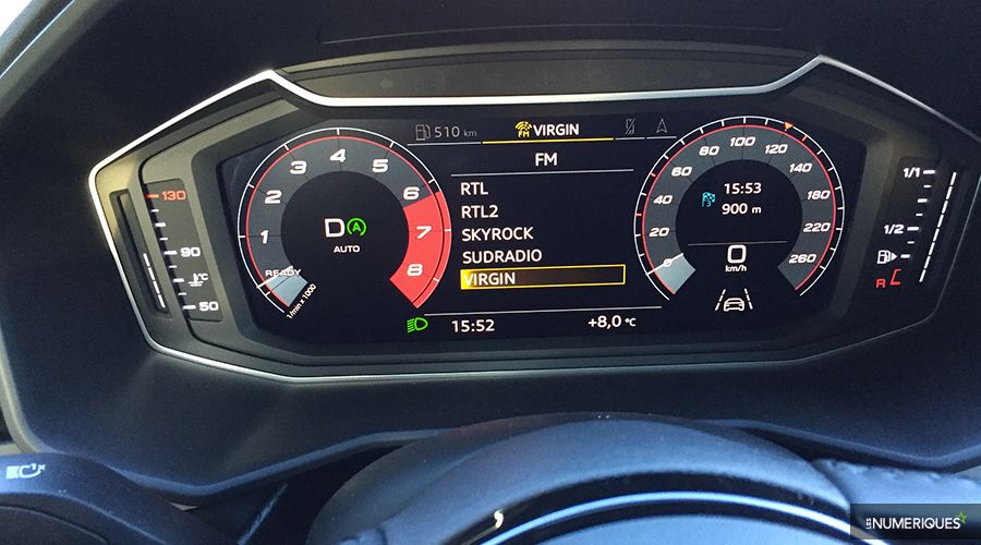 Heureusement, l'équipement multimédia peut venir gommer en partie cette impression en mettant la main au portefeuille. Tout comme ses aînées (Audi A4, A6, A7, A8 et TT), cette A1 Sporback bénéficie du fameux Virtual Cockpit, cet écran numérique de 10,25 pouces (diagonale de 26,03 cm)) situé sur le tableau de bord derrière le volant. Il est utile de préciser que les versions de base (A1 et Design) ne bénéficient pas de ce Virtual Cockpit, mais d'un Digital Cockpit (Notre essai). Contrairement au Virtual Cockpit où il est possible d'afficher deux vues différentes via la touche View (soit  deux énormes compteurs de vitesse et régime moteur séparés par une carte de navigation, soit une grande carte de navigation avec deux compteurs réduits), le Digital Cockpit laisse uniquement apparaître un compte-tours et un tachymètre, toujours en version numérique. Le Virtual Cockpit est de série sur les versions Design et Design Luxe et en option sur notre version S-Line.