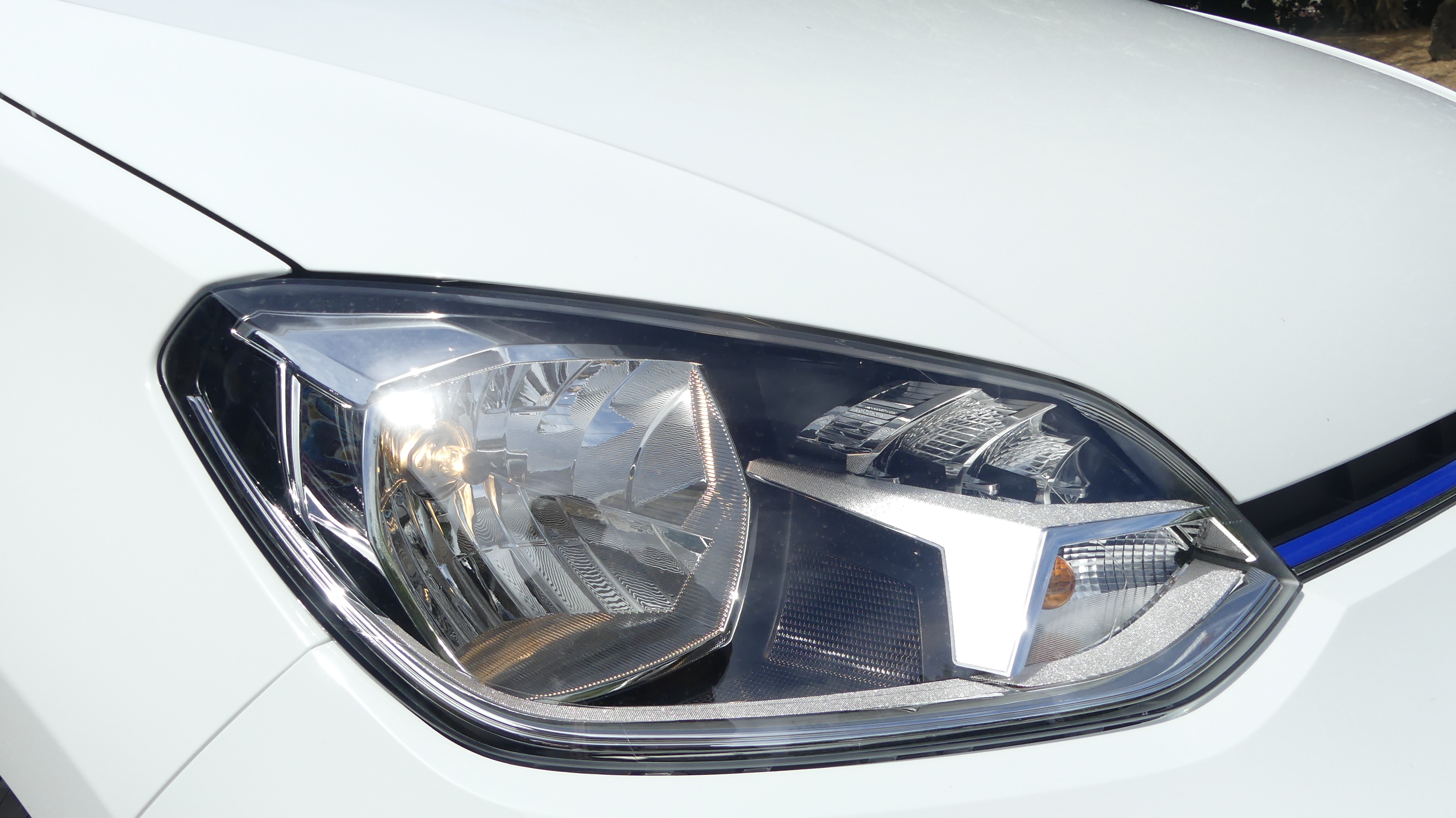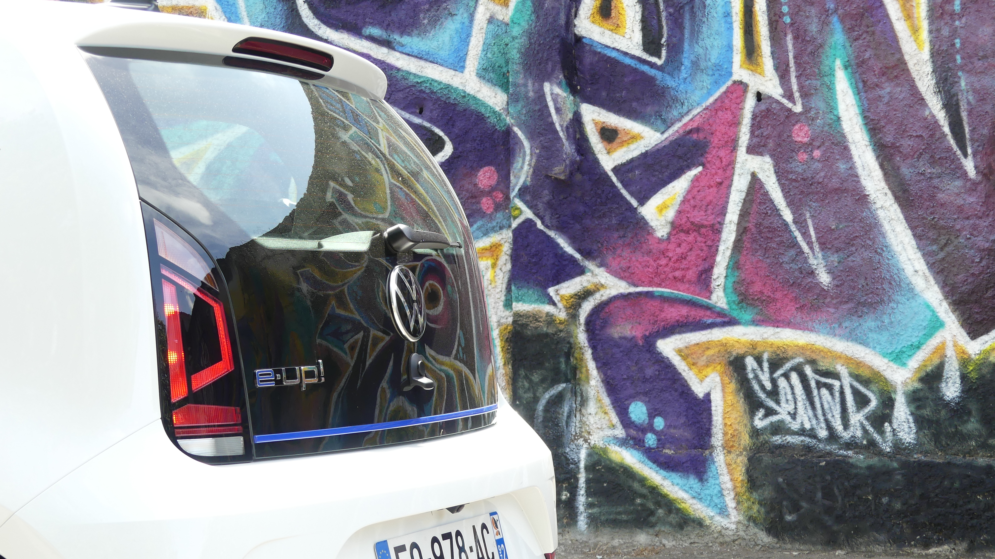 Citadine plus que jamais notre e-Up à été dessinée pour se faufiler avec agilité dans les centres villes tout en offrant une facilité exemplaire pour se garer… En effet avec ses 3,60 m de longueur et ses 1,65 m de large autant dire qu’elle est conçue pour vous ensoleiller la vie... Ses phares en formes de gros yeux ouverts et son museau pointant la rend plutôt branchée… Remarquez que pour la différencier du modèle thermique elle se dote d’une baguette décorative bleue, du logo Volkswagen intégré et de la signature en C originale des projecteurs LED,(Les fameux gros yeux...).