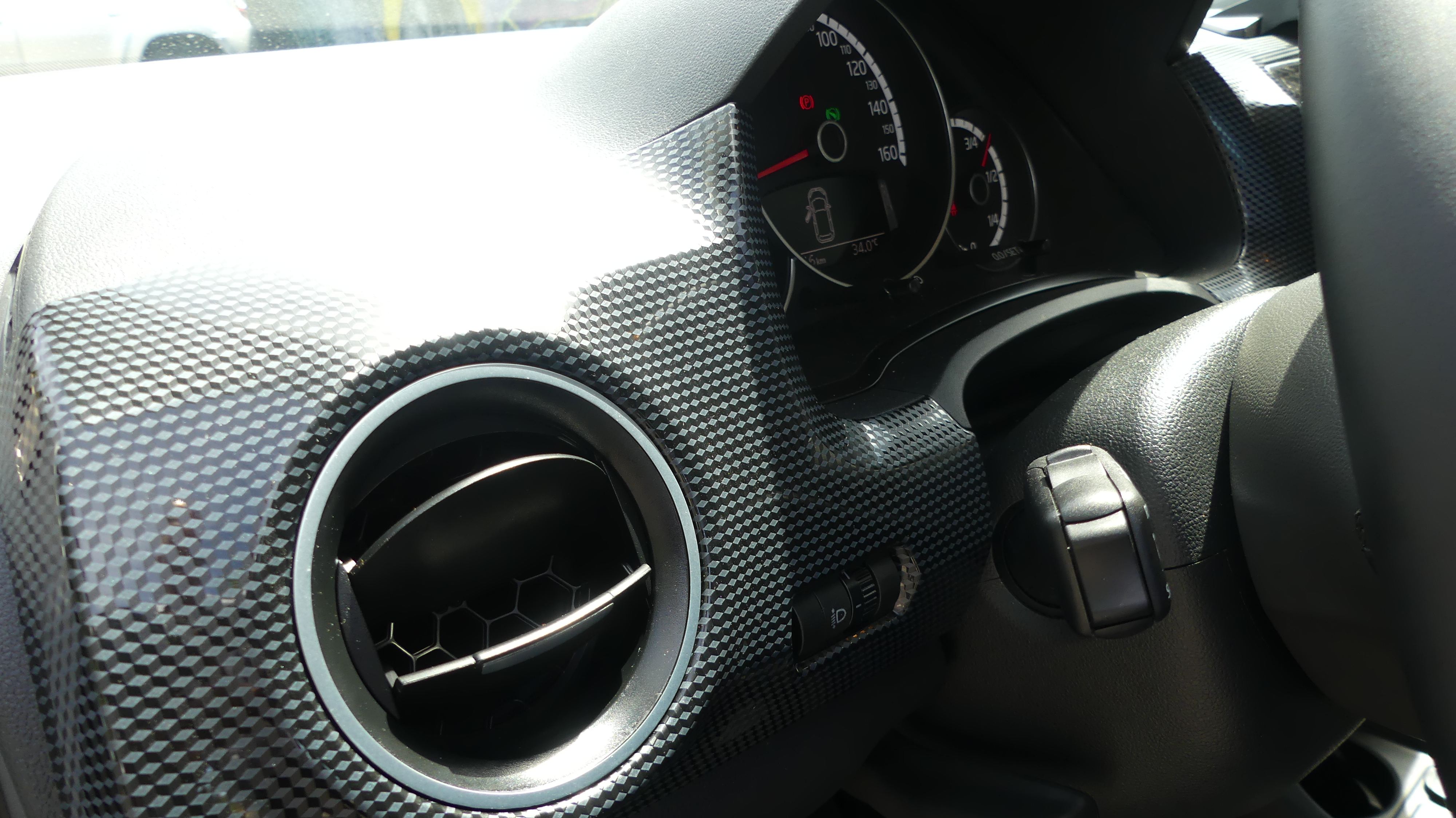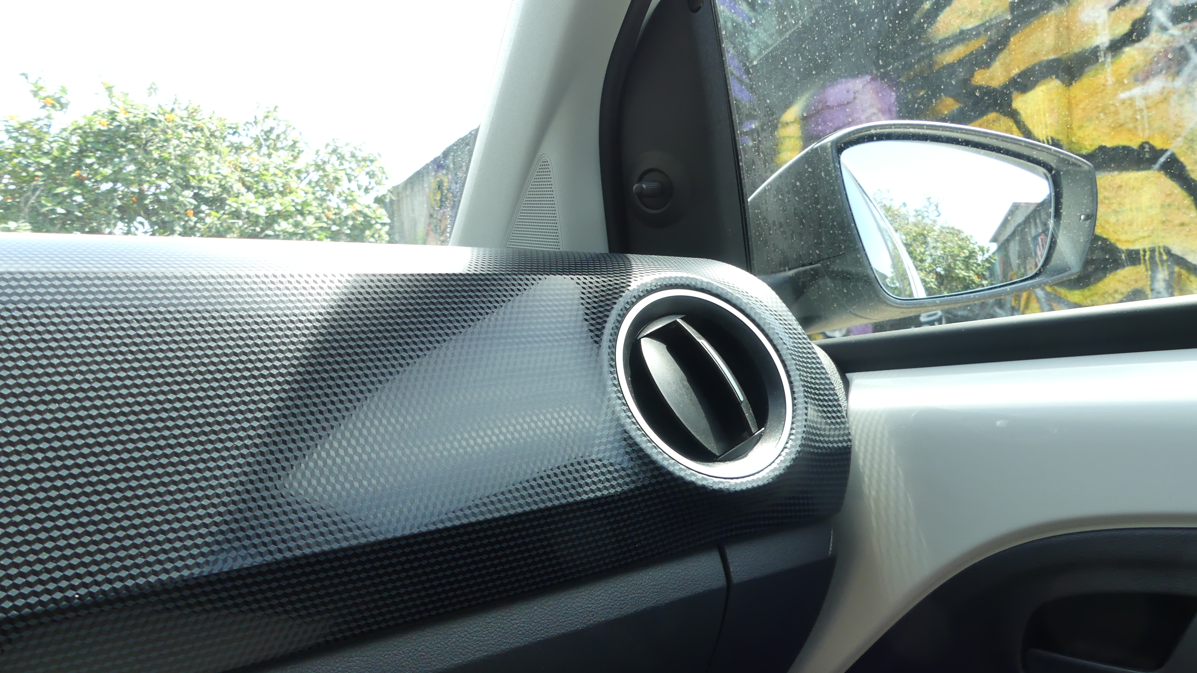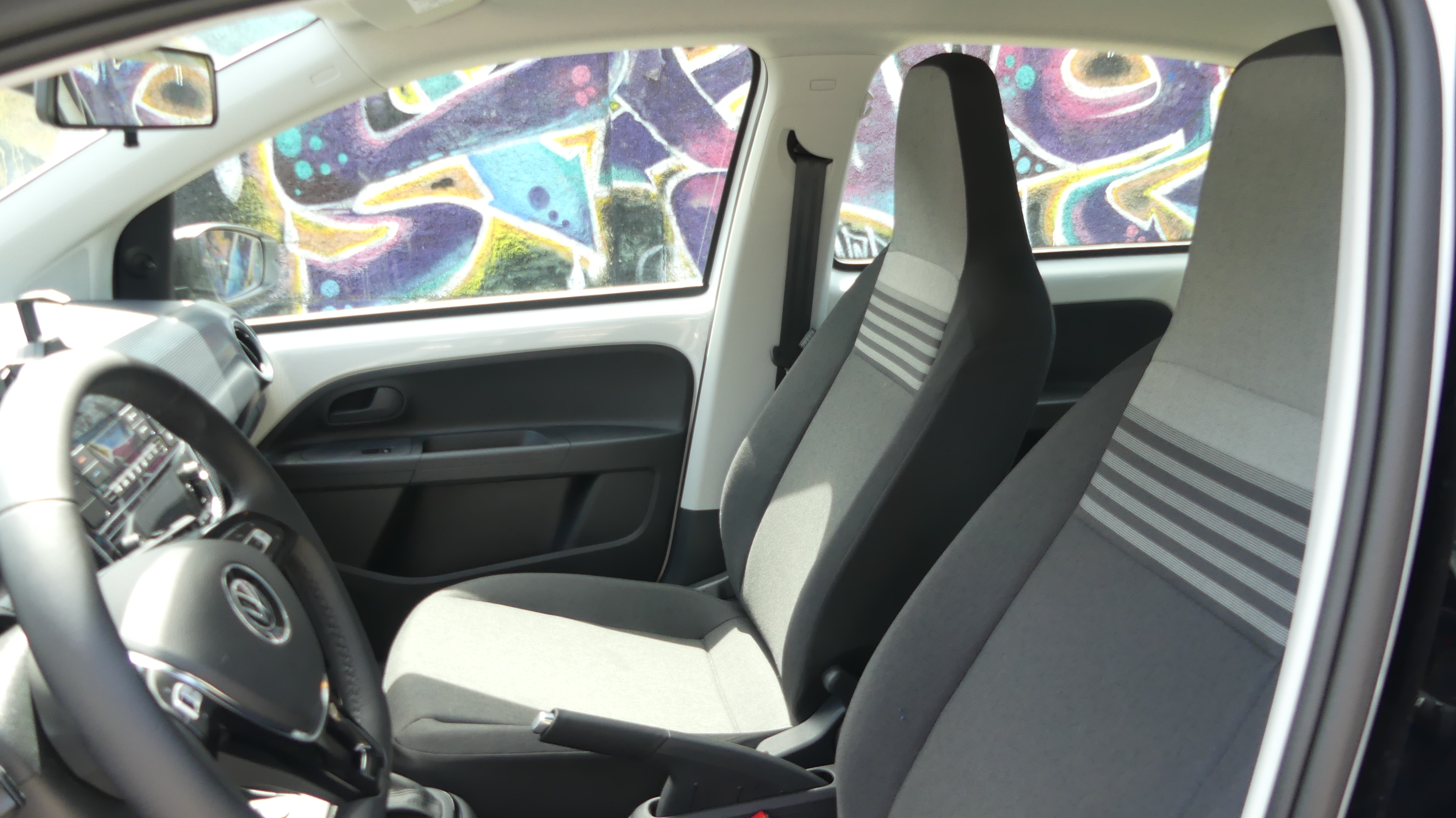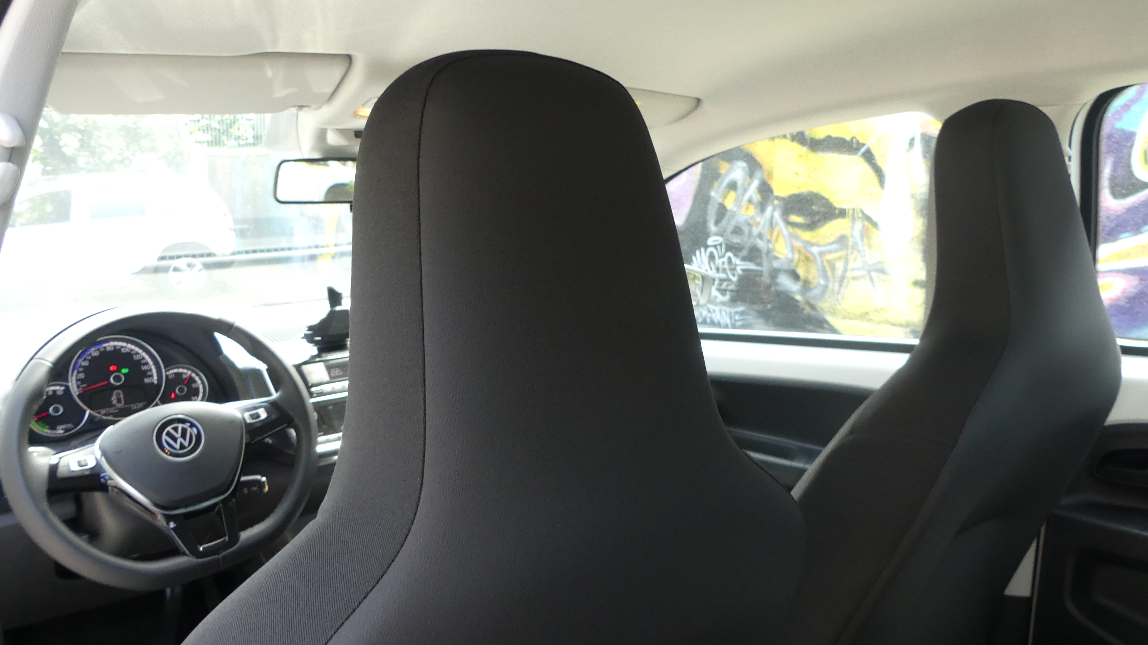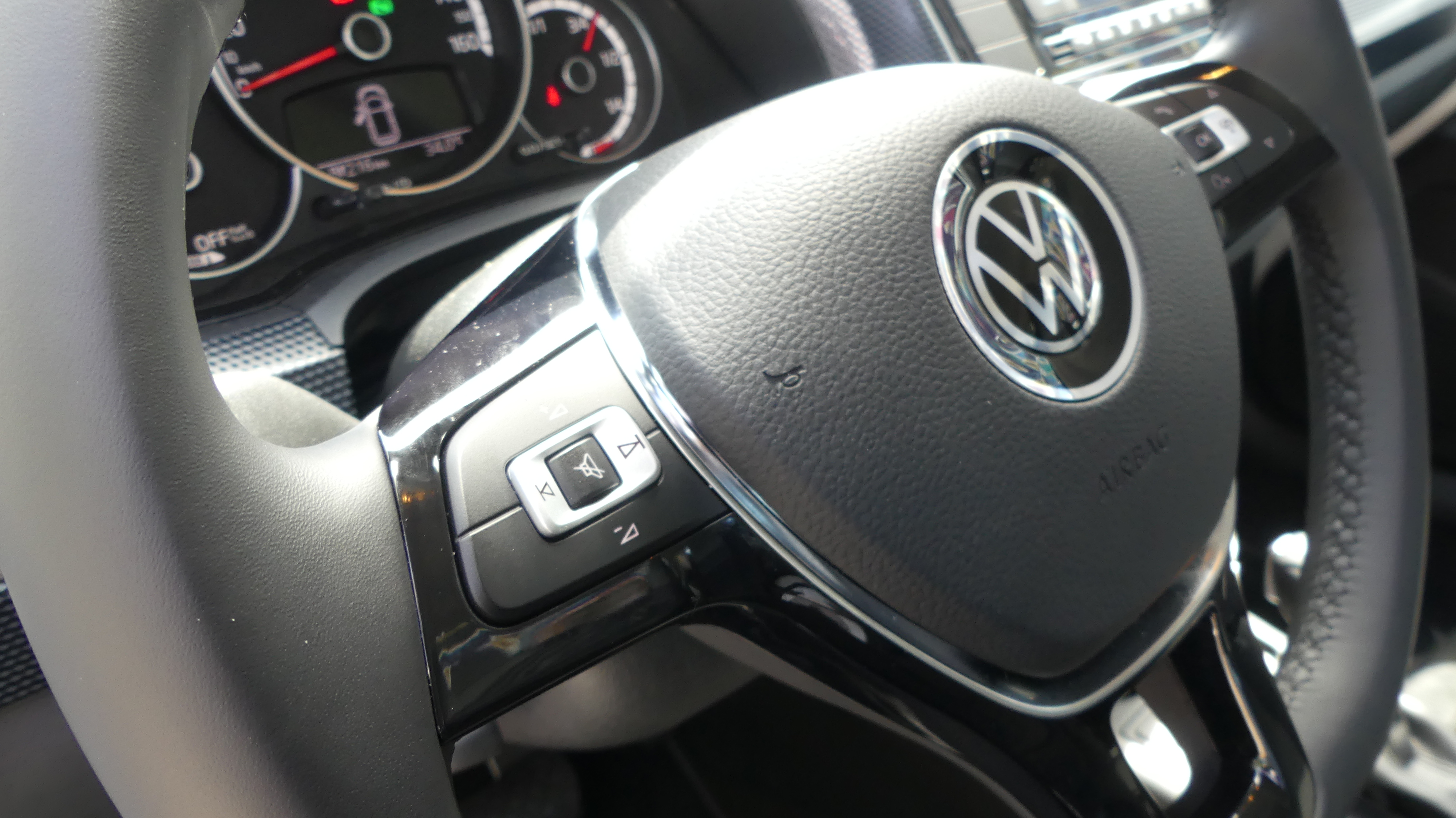 Vous pouvez opter pour le Pack Style. La peinture de toit noire assortie aux rétroviseurs extérieurs noirs ainsi que les vitres latérales et la lunette arrière teintées s'ajoutent aux jantes alliage léger 15'' "Blade" pour souligner le design extérieur du Pack Style. Vous pouvez également opter pour les jantes en alliage léger 16'’ "Upsilon" disponibles en option. ... Petit vaisseau futuriste semblant ramassé sur lui-même non ? Mais ne vous y trompez pas, la Volkswagen e-Up réserve d’assez bonnes surprises dans l’habitacle…